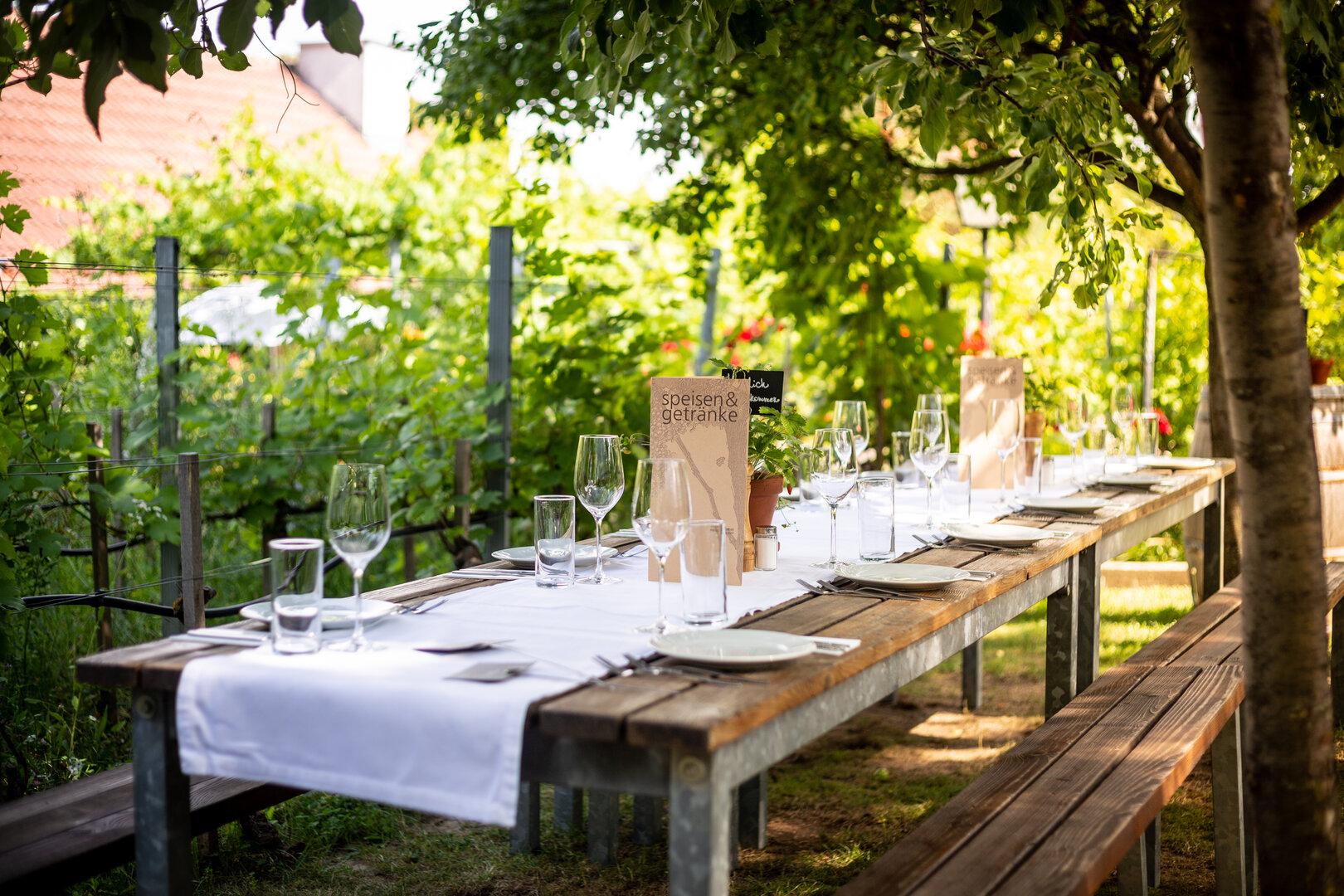 Platz nehmen in der Stube oder weinumrankten Laube: Ins Glas kommen die ausgezeichneten Göbel-Weine, dazu serviert wird erstklassige Küche mit saisonalen Spezialitäten. Besonders empfehlenswert: die Gerichte vom Strohschwein und die Altwiener Mehlspeisen.